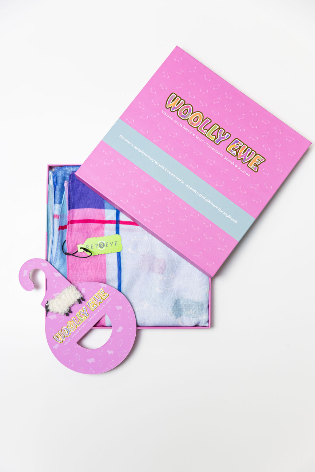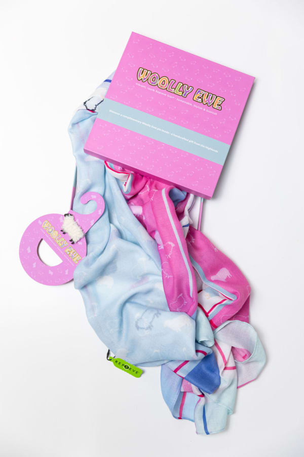 Woolly Ewe repreve sacrf made form recycled plastic bottles. Come sin gotgeous gift box with hanger and handcrafted ewe pin. Gives you the option how to display!