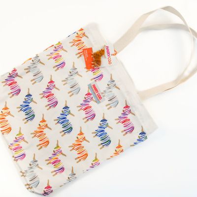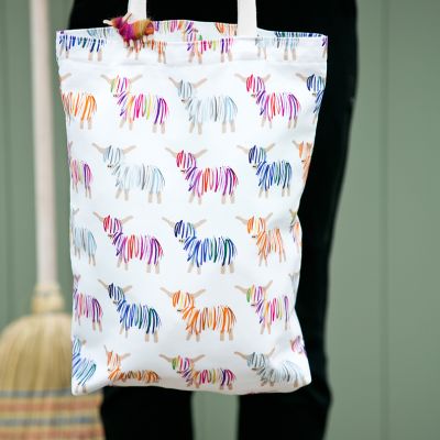 Our tote bag is 100% cotton with sturdy cotton handles and is printed in the UK with our vibrant Hairy Coo design. It measures 40 cm long and 36 cm wide. The handles are 25 cm long.