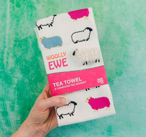 Each tea towel has a branded cardboard presentation wrap with a handmade Woolly Ewe magnet attached to it.