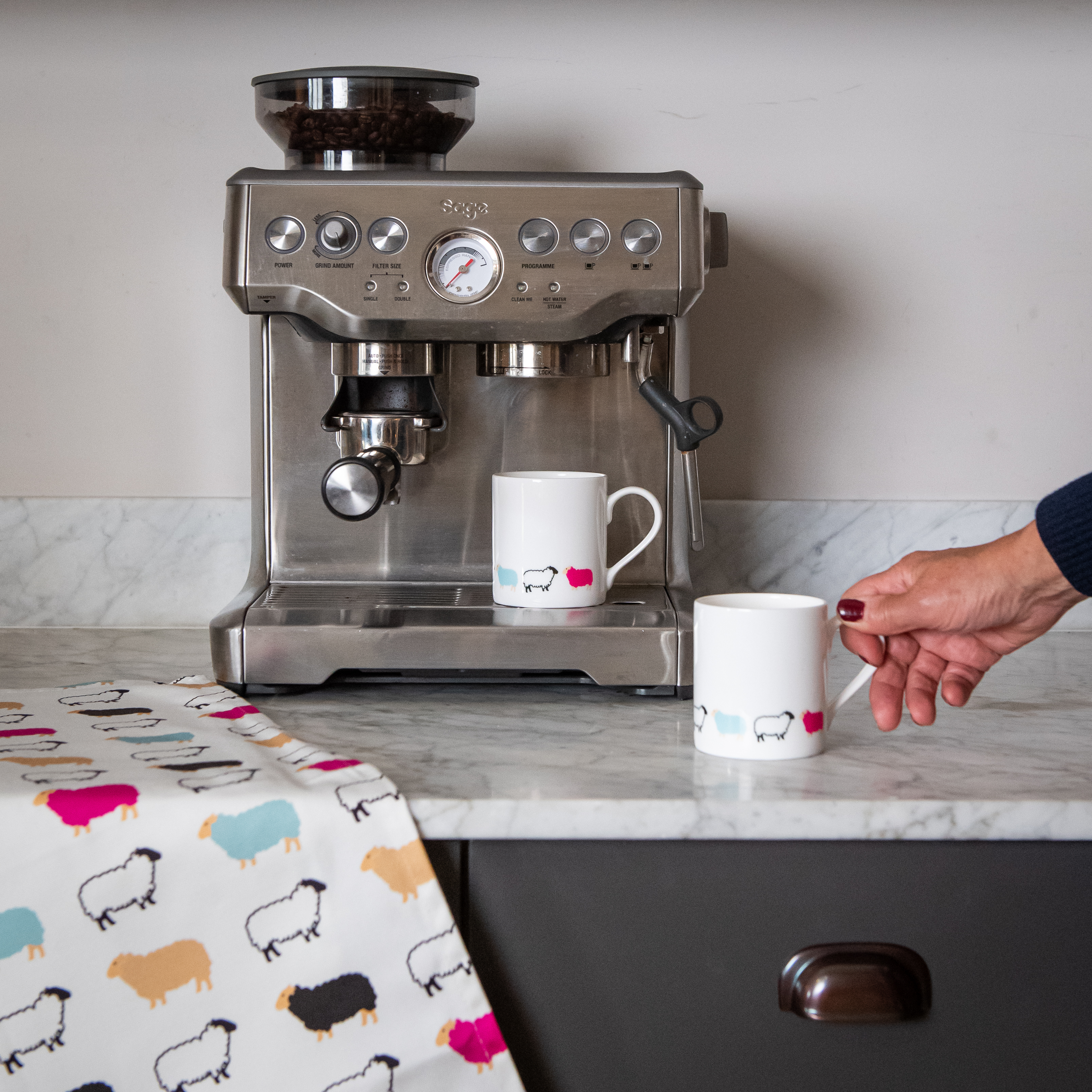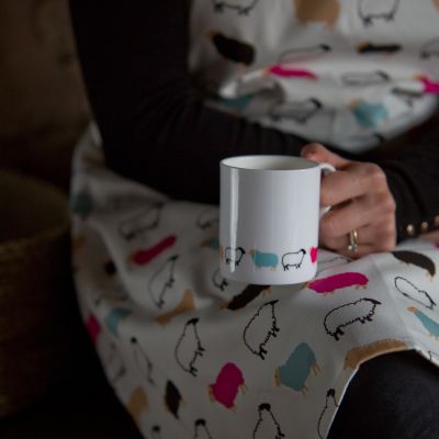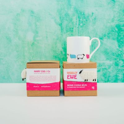 Our Woolly Ewe mug is 100% bone china and made in the UK. It comes in a cardboard presentation box with a cardboard wrap and handmade Woolly Ewe magnet attached.