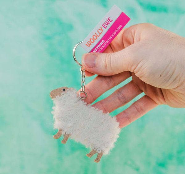 Hand-wrapped keyring in hand-dyed wool. With branded tag