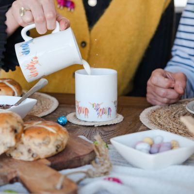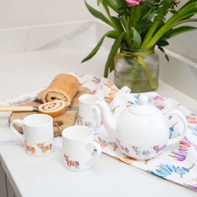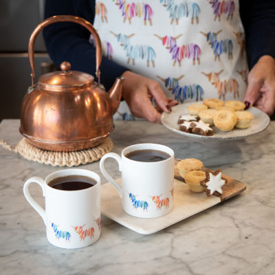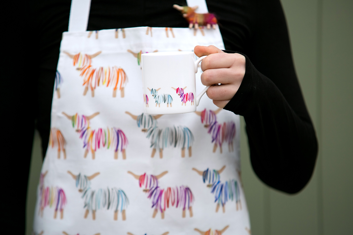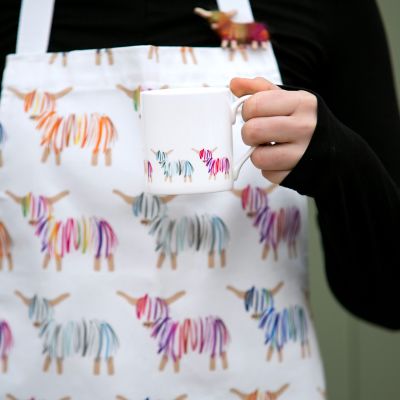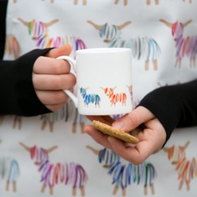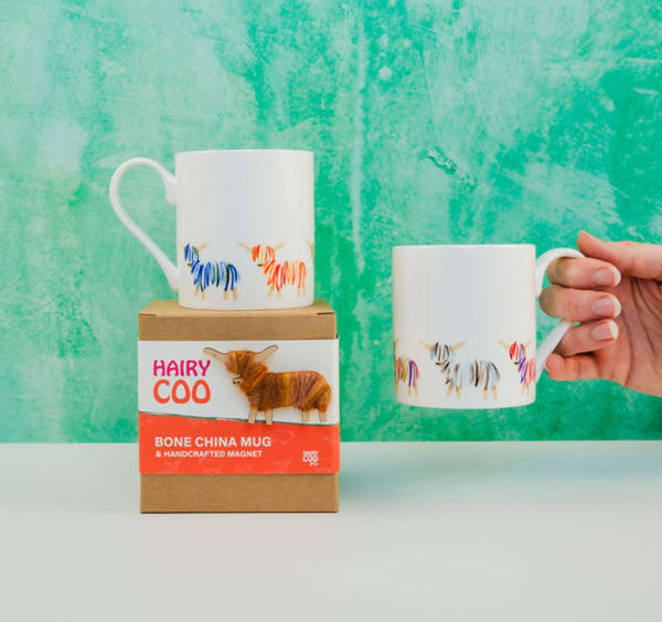 Our Hairy Coo mug is 100% bone china and made in the UK. It comes in a cardboard presentation box with a cardboard wrap and handmade Hairy Coo magnet attached.